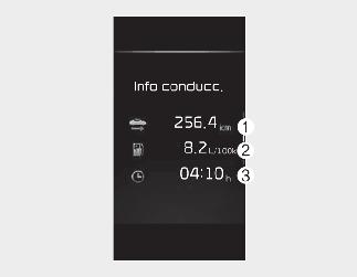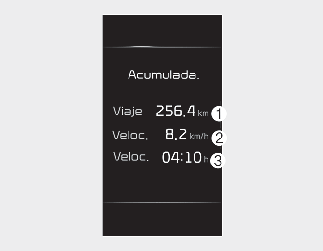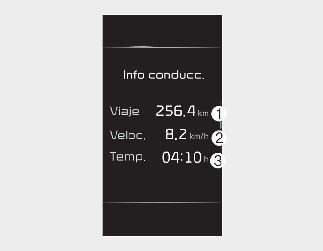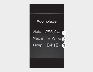 Muestra la distancia del recorrido acumulada (1), velocidad o consumo medio de combustible (2) y el tiempo total de conducción (3).