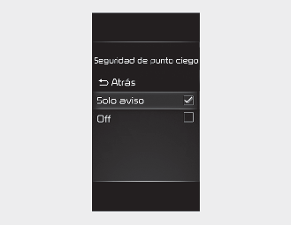Con el interruptor de encendido o el botón ENGINE START/STOP (inicio/parada del motor) en la posición ON (activado), seleccione o cancele la selección de "Asistencia al conductor → Seguridad para puntos ciegos" en el menú Ajustes para indicar si se utiliza cada una de las funciones. Si selecciona "Solo aviso", el aviso de colisión en punto ciego avisará al conductor con un mensaje de advertencia y un sonido de advertencia, dependiendo del nivel de riesgo de colisión. Si selecciona "Off" (Desactivado), el aviso de colisión en punto ciego se apagará.