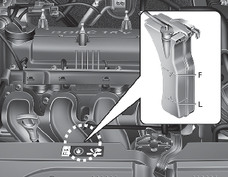 El nivel de refrigerante debería estar entre las marcas F y L (o MÁX. y MÍN.) que se encuentran en el indicador de nivel de refrigerante cuando el motor está frío.