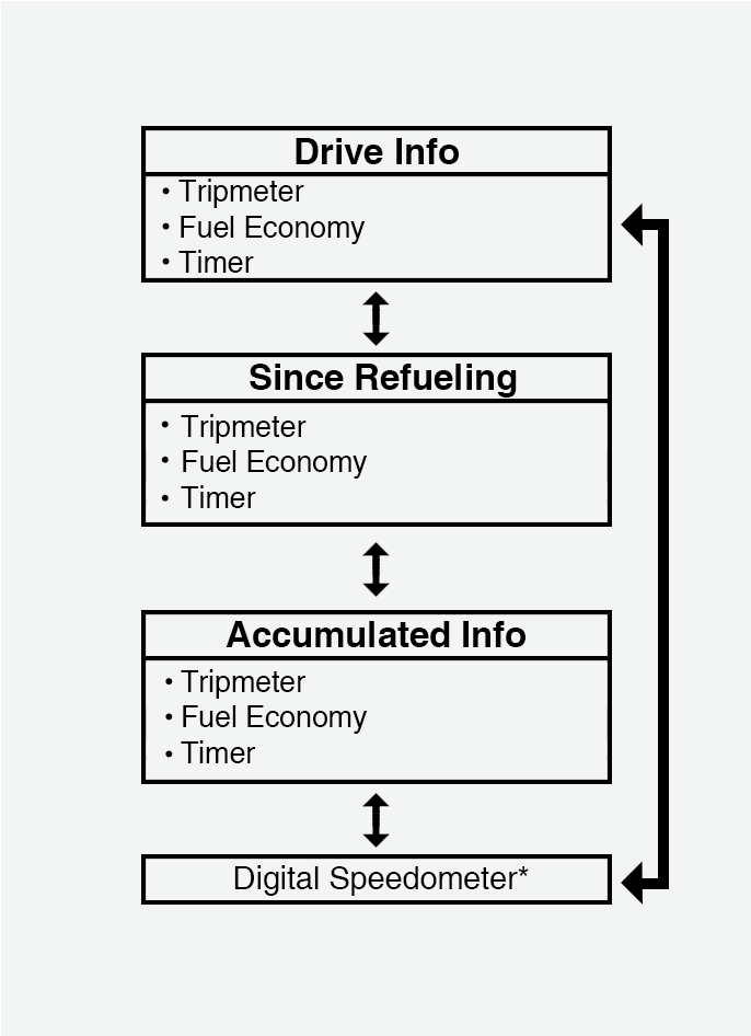 This display shows the trip distance, the average fuel efficiency, and the instant fuel efficiency (or the total driving time) since refueling.