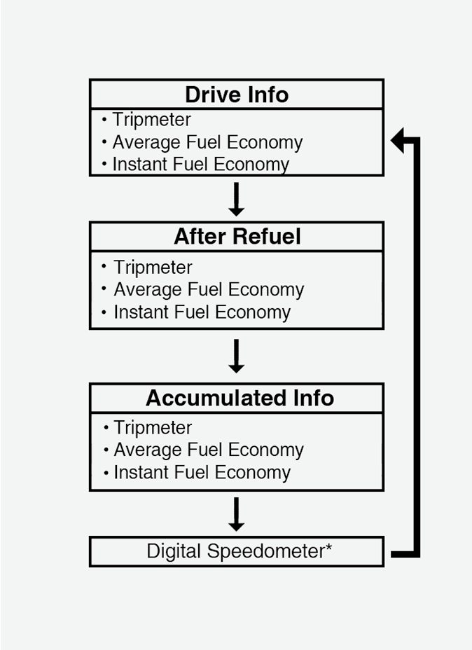 This display shows the trip distance, the average fuel efficiency, and the total driving time information once per one ignition cycle.