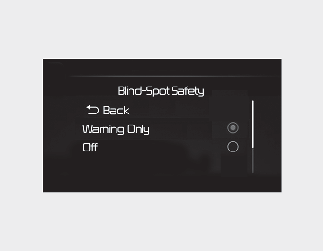 With the engine on, select or deselect 'Driver Assistance → Blind-Spot Safety' from the Settings menu to set whether or not to use each function.