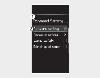 Seguridad frontal: En función de los niveles de riesgo de colisión, sonará un aviso sonoro y el frenado recibirá asistencia. Si se desactiva el siguiente menú, la Asistencia de prevención de colisión frontal se apagará y la luz de advertencia (