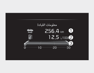 تعرض هذه الشاشة مسافة الرحلة المتراكمة (1) ومتوسط كفاية الوقود (2) وتوفير الوقود الفوري (3)، ووقت القيادة الكلي (4).