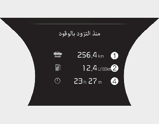 تعرض هذه الشاشة مسافة الرحلة المُجمَّعة (1)، ومتوسط كفاءة الوقود (2)، وتوفير الوقود الفوري (3)، وإجمالي وقت القيادة (4) بعد إعادة التزود بالوقود.