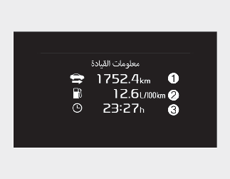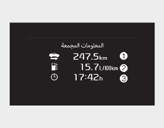تعرض هذه الشاشة مسافة الرحلة المتراكمة (1) ومتوسط كفاية الوقود (2) ووقت القيادة الكلي (3)، بعد إعادة التزود بالوقود.