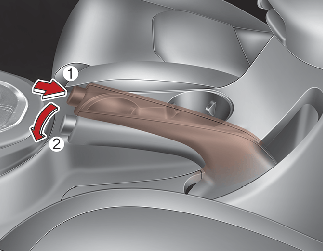 • لتحرير فرامل اليد، قم أولاً بتعشيق فرامل القدم ثمّ اسحب ذراع فرامل اليد قليلاً. ثمّ اضغط على زر التحرير (1) واخفض ذراع فرامل اليد (2) مع استمرار الضغط على الزر.