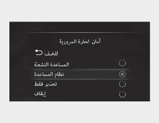 في حال تحديد "Warning Only" (تحذير فقط)، يحذر نظام المساعدة على الالتزام بالحارة المرورية السائق بتنبيه صوتي واهتزاز بعجلة القيادة (إن وجد) عند اكتشاف خروج عن الحارة المرورية. يجب أن يوجه السائق المركبة.