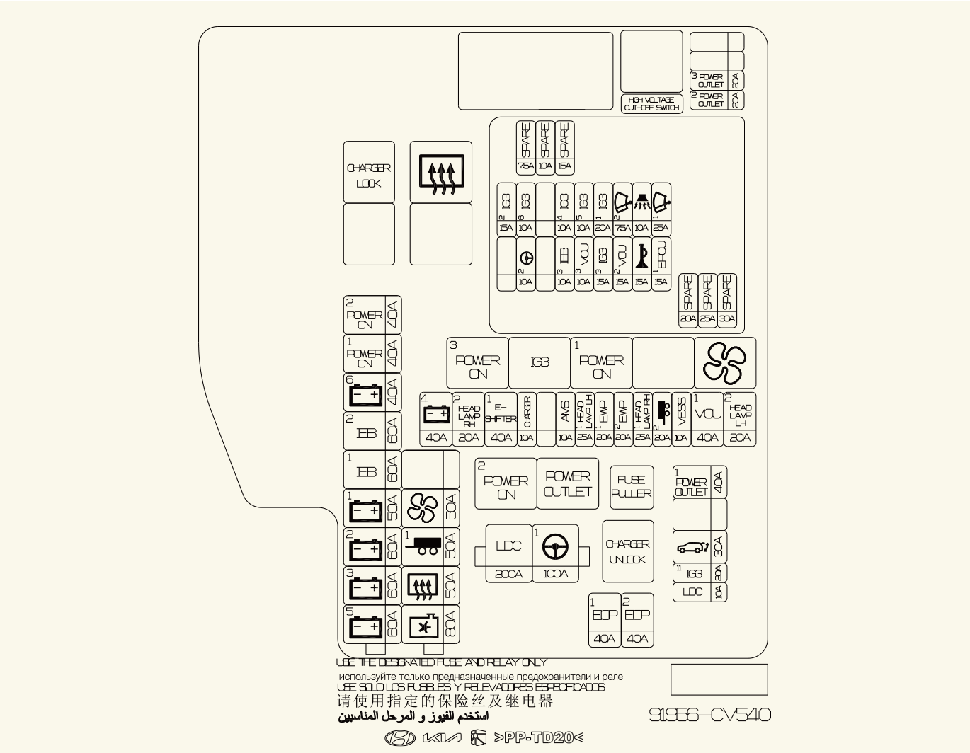 PDC-verbindingsblok (vergrendelingsrelais voor langdurige belasting, zekering: IAU, ECS, BATTERY MANAGEMENT, AIR BAG2, MEMORY1, SPARE3 (B+), A/C2, E-CALL, IBU1, BRAKE SWITCH, MULTIMEDIA, DOOR LOCK, MODULE1) |