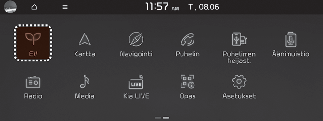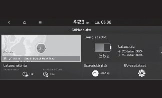 Kun valitaan “EV”-valikko AVN home näytössä tai painetaan “EV”-painiketta ilmanoton ohjauksen painikkeen vasemmalla puolella, voit siirtyä EV-tilaan.