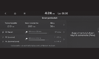 Valitse näytöllä ”EV → Energy information (Energiatiedot)→ Driving range, battery’ (Ajomatka, akku).