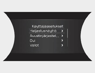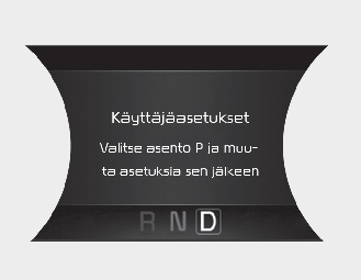 Oman turvallisuutesi takia muuta käyttäjän asetuksia vasta pysäköityäsi auton, kytkettyäsi seisontajarrun ja vaihdettuasi vaihteen P (pysäköinti) -asentoon.