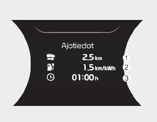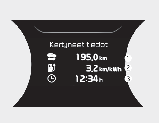Tämä näyttö näyttää matkan pituuden (1), keskimääräisen energiankulutuksen (2) ja kokonaisajoajan (3).