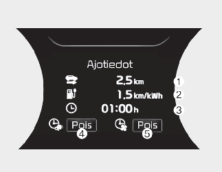 Jokaisen ajosyklin lopussa näyttöön tulee ajotietoviesti. Tämä näyttö esittää matkan ajomatkan pituuden (1), keskimääräisen energiankulutuksen (2), ajoajan (3), latausajan tila (4) ja ilmastoinnin ajan (5).