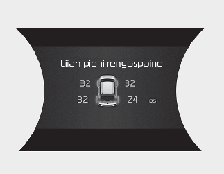 Tämä varoitusviesti näytetään, jos renkaan paine on matala. Auton vastaava rengas valaistuu.