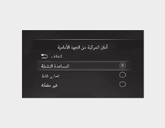 عندما يكون المحرك قيد التشغيل حدد "Driver assistance (مساعدة السائق) ← Forward safety (سلامة السيارة من الأمام)" من قائمة Settings (الإعدادات) لتحديد استخدام كل وظيفة من عدمه.