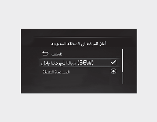 عندما يكون المحرك قيد التشغيل، حدد "Driver Assistance" (مساعدة السائق) ← "Blind-Spot Safety" (السلامة في المنطقة المحجوبة) ← "Safe Exit Warning (SEW)" (تحذير الخروج الآمن) من قائمة "Settings" (الإعدادات) لتشغيل نظام تحذير الخروج الآمن، وألغ التحديد لإيقاف تشغيل الوظيفة.