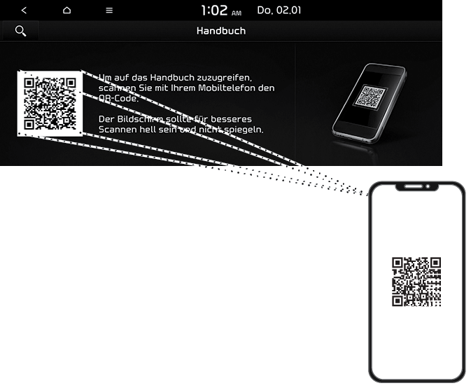 1. QR-Code scannen: Drücken Sie auf [SETUP] > [Allgemein] > [Systeminfo] > [Online-Handbuch]. Scannen Sie den QR-Code und tippen Sie auf die Benachrichtigung, um zur Webseite zu gelangen.