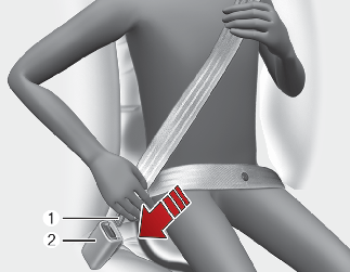 Um Ihren Gurt anzulegen, ziehen Sie das Gurtband aus der Gurtrolle und schieben Sie die Schließzunge (1) in das Gurtschloss (2). Ein Klickgeräusch zeigt an, dass die Schließzunge im Gurtschloss verriegelt ist.