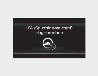 Wenn der Fahrer nach der Lenkradwarnung immer noch nicht die Hände am Lenkrad hat, erscheint die Warnmeldung „Lane Following Assist (LFA) canceled“ (Spurhalteassistent (LFA) deaktiviert) und der Spurhalteassistent wird automatisch deaktiviert.