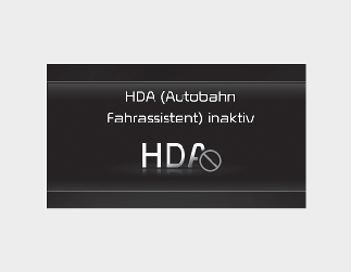 Wenn der Fahrer nach der Lenkrad-Warnung immer noch nicht die Hände am Lenkrad hat, erscheint die Warnmeldung „Highway Driving Assist (HDA) canceled“ (Fahrhilfe auf der Autobahn (HDA) abgebrochen) und die Fahrhilfe auf der Autobahn wird automatisch deaktiviert.