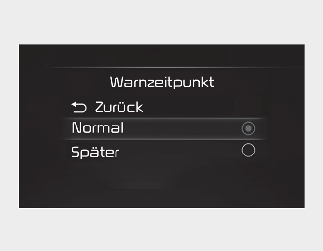 Wenn sich der Zündschalter oder der Knopf ENGINE START/STOP in der Stellung On befindet, wählen Sie "Einstellungen → Fahrerassistenz → Warnzeitpunkt" im Kombiinstrument oder "Einstellungen → Fahrzeug → Fahrerassistenz → Warnzeitpunkt" im Infotainmentsystem, um den Zeitpunkt für die Aktivierung der ersten Warnung für die rückwärtige Querverkehr-Kollisionswarnung zu ändern.