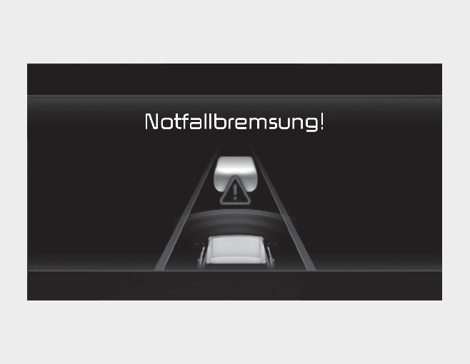 Um den Fahrer bei einer unterstützten Notbremsung zu warnen, erscheint die Warnmeldung „Emergency Braking“ (Notbremsung) auf dem Kombiinstrument, es wird ein Warnton ausgegeben und das Lenkrad vibriert.
