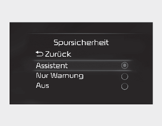 Wählen Sie, wenn der Motorstart-/Stopp-Knopf in Position On steht, die Option „Einstellungen → Fahrerassistenz → Spursicherheit“ am Kombiinstrument oder „Einstellungen → Fahrzeug → Fahrerassistenz → Spursicherheit“ im Infotainmentsystem aus, um festzulegen, welche Funktionen verwendet werden sollen.