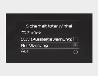 Wählen Sie, wenn der Motorstart-/Stopp-Knopf in Position On steht, die Option „Einstellungen → Fahrerassistenz → Totwinkel-Kollisionssicherheitssystem“ am Kombiinstrument oder „Einstellungen → Fahrzeug → Fahrerassistenz → Totwinkel-Kollisionssicherheitssystem“ im Infotainmentsystem aus, um festzulegen, welche Funktionen verwendet werden sollen.