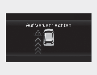 Wenn ein sich von hinten näherndes Fahrzeug in dem Moment erkannt wird, in dem eine Tür geöffnet wird, erscheint die Warnmeldung „Auf Verkehr achten“ auf dem Kombiinstrument, erscheint die Warnleuchte am Außenspiegel und es ertönt ein akustisches Warnsignal.
