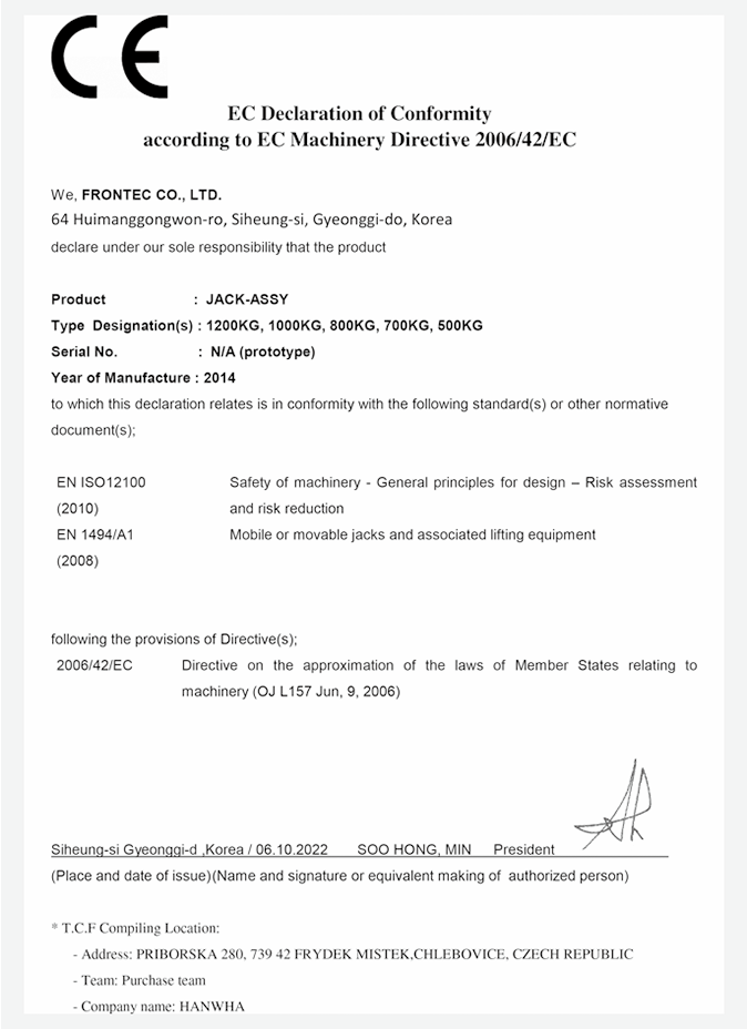 Konformitätserklärung für den Wagenheber