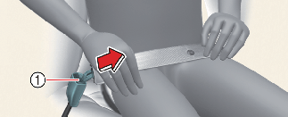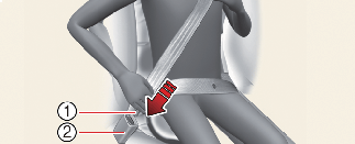 Pull it out of the retractor and insert the metal tab (1) into the buckle (2). There will be an audible "click" when the tab locks into the buckle.