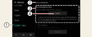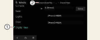 To delete a shared key(smartphone), select Setup > Vehicle > Digital Keys >Smartphone Key > Shared keys > [Group] > Delete from the infotainment system.