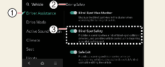 With the vehicle on, select Setup → Vehicle → Driver Assistance → Blind-Spot Safety on the infotainment system.