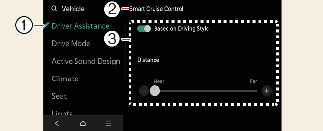 If equipped with Based on Driving Style, Based on driving mode and Based on driving style can be selected from the infotainment system screen by selecting Setup → Vehicle → Driver Assistance → Smart Cruise Control.