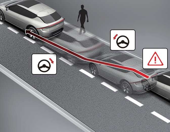 Evasive Steering Assist function may help to avoid a collision with a pedestrian or cyclist ahead in the same lane. When a risk of collision is detected, Evasive Steering Assist function may warn the driver and if there is space to avoid collision in the lane, it will assist the driver's steering.
