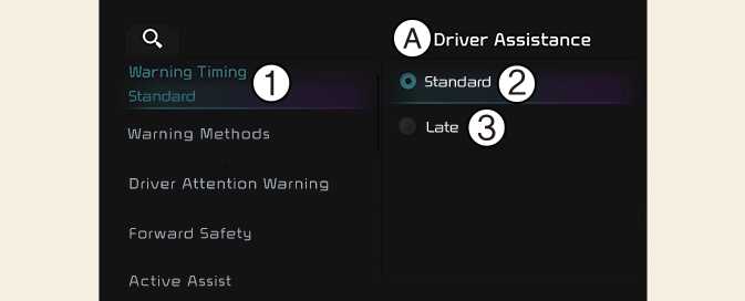 When the vehicle is first delivered, Warning Timing is set to Standard. If you change the Warning Timing, the warning time of other Driver Assistance systems may change.