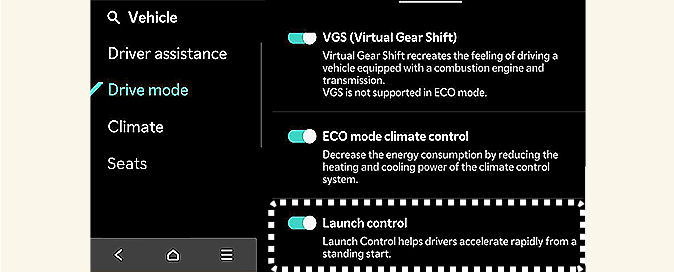 Wählen Sie auf dem Bildschirm des Infotainment-Systems Einstellungen → Fahrzeug → Startkontrolle.