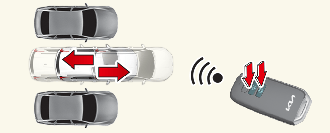Die Einparkhilfe funktioniert nur, wenn sich der Smart-Key maximal 4 m (13 ft.) vom Fahrzeug entfernt befindet. Wenn sich das Fahrzeug nicht bewegt, auch wenn die Taste für Vorwärts- oder Rückwärtsbewegung auf dem Smart-Key gedrückt wird, überprüfen Sie den Abstand zum Fahrzeug und drücken Sie die Taste erneut.