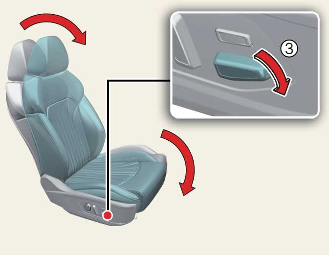 시트 작동이 완료된 후 보다 편한 자세를 위하여 시트 조절 스위치(2), (3)을 사용하여 직접 조정할 수도 있으며, 조정 시 쿠션과 등받이가 함께 회전합니다.