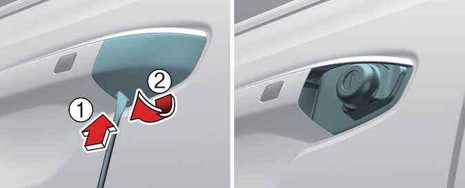 비상시 열쇠와 같이 길고 납작한 물체(1)로 커버(2) 분리 후 열쇠를 이용하여 운전석 도어를 잠그거나 열 수 있습니다.