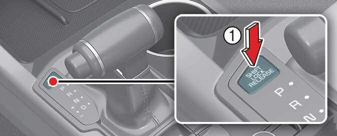 배터리가 방전되었거나 또는 시동 「ON」 상태가 아니면 브레이크 페달을 밟아도 변속 레버가 「P」(주차) 위치에서 「R」(후진) 위치로 조작되지 않습니다. 이때는 변속 레버 앞쪽에 위치한 「SHIFT LOCK RELEASE」버튼(1)을 누르면서 변속 레버 버튼을 눌러 변속 레버를 움직이면 다른 위치로 조작이 가능합니다.