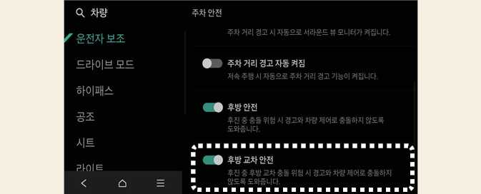 후방 교차 안전 OMV033140 시동 「ON」 상태에서 인포테인먼트 시스템의 설정 → 차량 → 주차 안전 → 후방 교차 안전을 차례로 선택하십시오. 후방 교차 충돌방지 보조가 켜집니다.