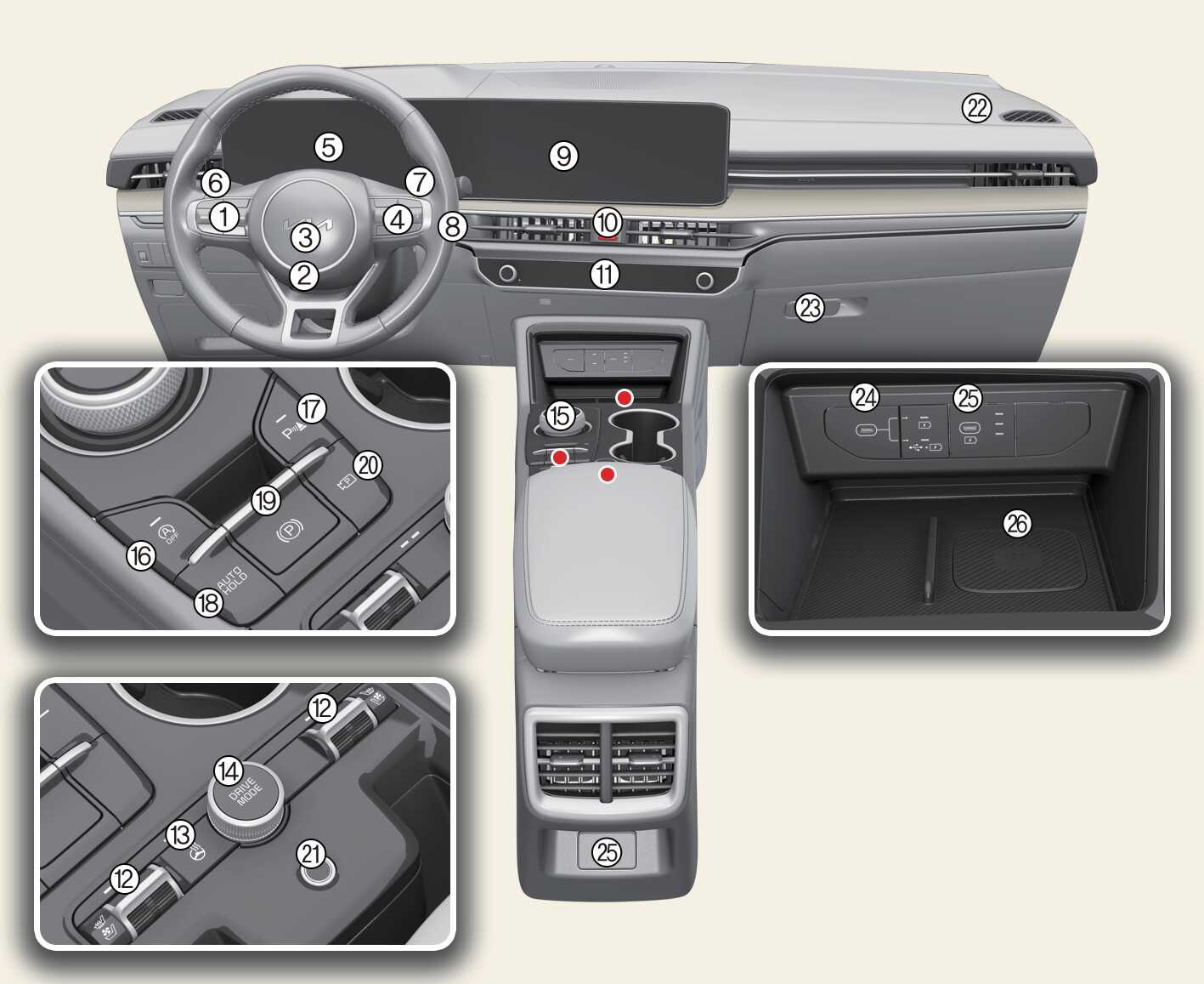 본 도안은 실제 차량과 다를 수 있습니다. (스위치의 형상 및 배열은 사양 적용에 따라 달라질 수 있습니다.)