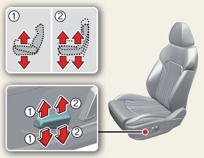 조절 스위치의 앞쪽(1)을 올리거나 내리면 좌석의 앞부분이 올라가거나 내려오고, 조절 스위치의 뒤쪽(2)을 올리거나 내리면 좌석 전체가 올라가거나 내려옵니다.