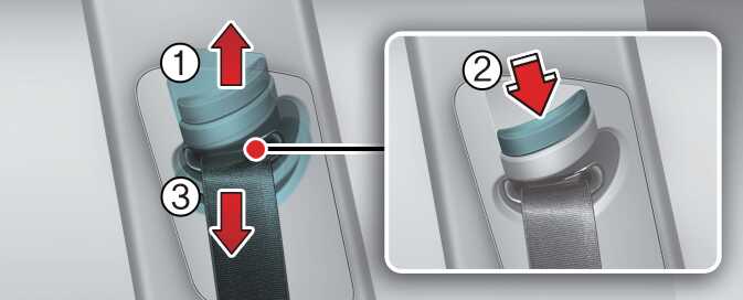 벨트의 높이를 낮추려면, 고정 장치를 잡고 잠금 버튼을 누른 상태(2)에서 밑으로 내리십시오(3).