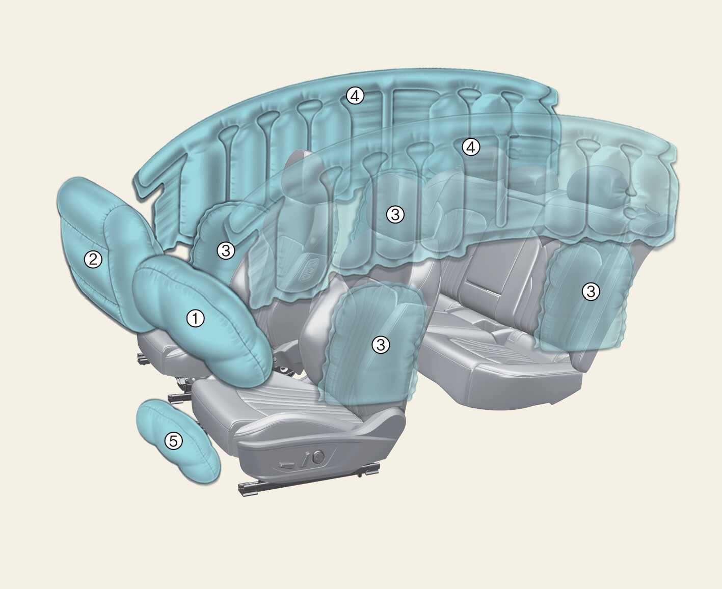 에어백(보조 구속 장치) ODL3023035 위의 그림은 실제 차량에 적용된 에어백의 형상과 다를 수 있습니다. 운전석 에어백 동승석 에어백 사이드 에어백 커튼 에어백 운전석 무릎 에어백