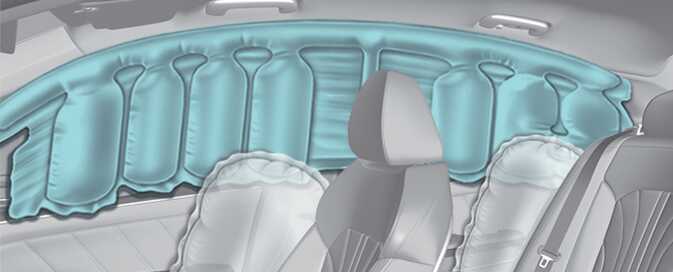 커튼 에어백은 양쪽 도어 위쪽의 천장 끝에 내장되어 있습니다. 에어백 작동 조건이 되면 앞좌석과 뒷좌석 도어 쪽 탑승자의 머리를 보호하기 위해 작동합니다.