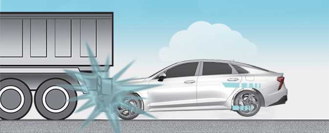 사면 충돌이나 추돌 시 정면 방향으로 전해지는 사고 충격은 정면 충돌이나 추돌 시 보다 약하게 전달되어 작동하지 않을 수 있습니다.