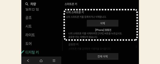 등록된 디지털 키 2(스마트폰)가 없으면 전체 삭제를 선택할 수 없습니다.